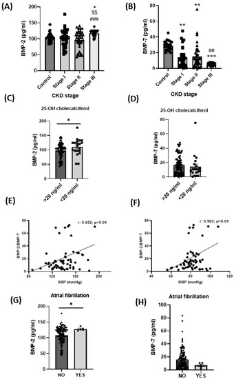 BMP-2 and BMP-7 levels in patients with CKD. Plasma levels of (A) BMP-2 and (B) BMP-7 in patients with different stages of CKD or healthy controls. Plasma levels of (C) BMP-2 and (D) BMP-7 according to 25-OH-cholecalciferol deficiency (<20 ng/mL). Correlation between the BMP-2/BMP-7 ratio with (E) SBP and (F) DBP. Plasma levels of (G) BMP-2 and (H) BMP-7 according to atrial fibrillation. Data are expressed as the mean ± SEM of n = 26–37. * p < 0.05, ** p < 0.01, and *** p < 0.001 compared to control, $$ p < 0.01 compared to stage I, ### p < 0.001, ## p < 0.01 compared to stage II; * p < 0.05 in (C,D) versus 25-OH-cholecalciferol >20 ng/dL.