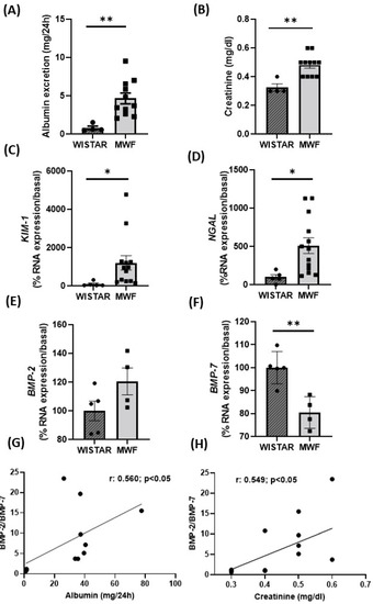 Renal function parameters in Wistar and MWF rats. (A) Urinary albumin excretion (UAE) and (B) creatinine plasma levels in Wistar and MWF rats. Renal mRNA expression of (C) KIM-1, (D) NGAL, (E) BMP-2, and (F) BMP-7 in Wistar and MWF rats. Correlation between the BMP-2/7 ratio and (G) urinary albumin excretion (UAE) or (H) creatinine plasma levels. Data are expressed as the mean ± SEM of n = 5–11 animals per group. * p < 0.05 and ** p < 0.01 compared to Wistar.