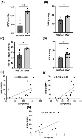 Hemodynamic parameters in Wistar and MWF rats. (A) Systolic blood pressure (SBP), (B) diastolic blood pressure (DBP), (C) pulse pressure (PP), and (D) pulse wave velocity (PWV) in Wistar and MWF rats. Correlation between the BMP-2/7 ratio and (E) systolic blood pressure (SBP), (F) diastolic blood pressure (DBP), or (G) pulse wave velocity (PWV). Data are expressed as the mean ± SEM of n = 5–11 animals per group. * p < 0.05 and ** p < 0.01 compared to Wistar.