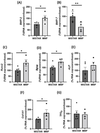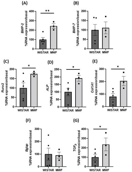 Expression of profibrotic and calcification makers in mesenteric perivascular adipose tissue (PVAT) of Wistar and MWF. mRNA expression level (A) BMP-2, (B) BMP-7, (C) Runx2, (D) Bglap, (E) alkaline phosphatase (ALP), (F) collagen 1A1 (Col1A1), and (G) TFGβ mRNA expression level. Data are expressed as the mean ± SEM of n = 3–5 animals per group). * p < 0.05, and ** p < 0.01 compared to Wistar.