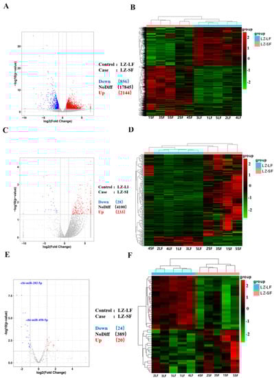 The criteria of expression difference fold |log2FoldChange| > 1 and significant p value < 0.05 were used to identify the differentially expressed genes. Up to 3000 DEmRNAs were detected in the LF (n = 5) and SF (n = 5) groups, with 2144 being upregulated in the SF group (Figure 1A). Cluster analysis of the differential expression genes separated the samples into two expected categories (Figure 1B). Furthermore, up to 261 annotated DElncRNAs were found in the SF group, and 28 were down-regulated (Figure 1C). DElncRNA clustering analysis revealed good integration between the two sample groups (Figure 1D). Finally, 44 candidate miRNAs were found to be differentially expressed, with 24 miRNAs being down-regulated in the SF group (Figure 1E). As expected, the clustering analysis results explained the significant differences between the two sample groups (Figure 1F). In total, 3000 DEmRNAs, 261 DElncRNAs, and 44 DEmiRNAs were detected in small follicles versus large follicles, with Table 2 listing the top ten DEmRNAs, DElncRNAs, and DEmiRNAs.
