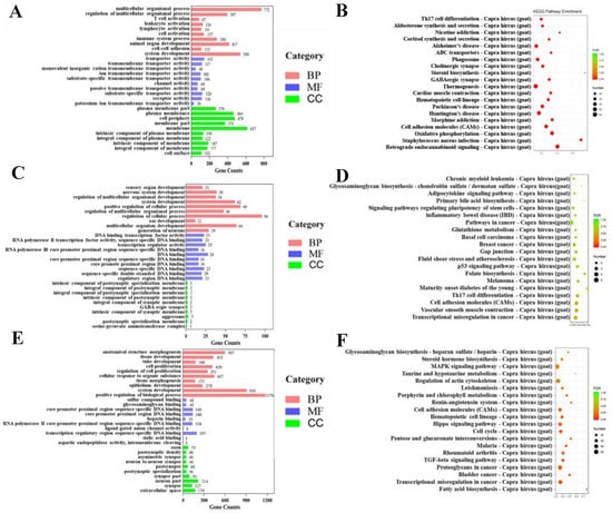 GO and KEGG enrichment analysis of DEmRNAs and target genes of DElncRNAs and DEmiRNAs. GO analysis of DEmRNAs (A) and predicted target genes of DElncRNAs (C) and DEmiRNAs (E). The top 20 KEGG pathways of predicted target genes for DEmRNAs (B) and DElncRNAs (D), and DEmiRNAs (F). “Count” means the number of predicted target genes enriched in this pathway. The color represents the degree of enrichment, with red representing significant enrichment. Red represents the biological process (BP), blue represents the molecular function (MF), and green represents the cell component (CC).