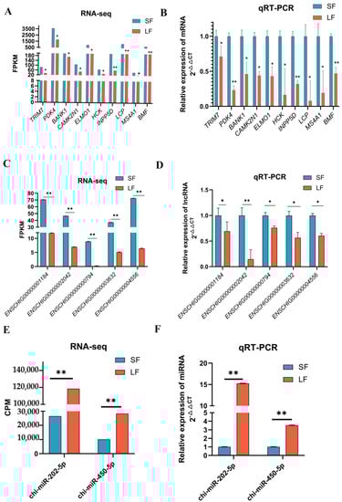 Differentially expressed mRNAs, lncRNAs and miRNAs were verified by qRT-PCR. (A,B): The expression levels of the 10 mRNAs were verified by qRT-PCR and compared with the results of RNA-seq. (C,D): The expression levels of the five lncRNAs were verified by qRT-PCR and compared with the results of RNA-seq. (E,F): The expression levels of the 2 miRNAs were verified by qRT-PCR and compared with the results of RNA-seq. The results were shown to be consistent with RNA-seq data by RT-qPCR. Data are shown as mean ±SD values (n = 3, * p < 0.05; ** p < 0.01 indicates significant difference).