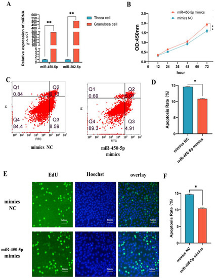 miR-450-5p stimulates the proliferation of GCs. (A) Expression of miRNA in follicular granulosa cells versus follicular theca cells. Results are shown as Mean ± SD, n = 4, ** p < 0.01 indicates a highly significant difference. (B) CCK8 line graph of miR-450-5p mimics and mimics NC. OD values at 450 nm were determined at 12 h, 24 h, 48 h, and 72 h. (Mean ± SD, ** p < 0.01). (C,D) Results of flow apoptosis measurements of miR-450-5p mimics versus mimic NC with apoptotic cells as a percentage of all cells. (Mean results ± SD, * p < 0.05 indicates significant difference). (E,F) EdU cell proliferation assay. Comparison of miR-450-5p mimics as well as mimics NC in EdU fuel (proliferating cells) as a percentage (%) of hoechst fuel (overall cells). Three replicates per group, mean ± SD,* p < 0.05 indicates a significant difference.