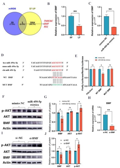 miR-450-5p targets BMF to activate PI3K/Akt signaling pathway (A): Comparison of genes upregulated in small follicles with target genes of miR-450-5p predicted by miRDB database. (B) BMF gene expression on small and large follicles in goats. (C) Expression of BMF gene after transfection with miR-450-5p. (D) Sequence comparison of miR-450-5p and comparison of WT-BMF and MUT-BMF target sequences. (E) Dual fluorescence changes of the original plasmid pGLOmir, wild plasmid WT, and mutant plasmid MUT with miR-450-5p (F,G) Western blot results of p-AKT, AKT, and BMF after transfection of miR-450-5p. (H) Expression of BMF gene after silencing BMF with siRNA. (I,J) Western blot results of p-AKT, AKT, and BMF silenced with siRNA. Reported experiments. Data are shown as mean ± SD values (n = 3). * p < 0.05; ** p < 0.01was considered statistically significant. ns: not significant for statistical results.