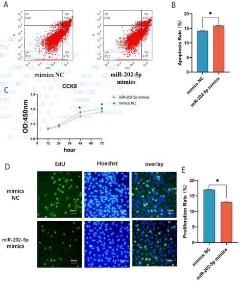 miR-202-5p induces the apoptosis of follicular GCs. (A,B) Flow cytometric results of miR-202-5p mimics vs. mimics NC. Flow cytometric results histogram of miR-202-5p mimics vs. mimics NC. (Mean results ± SD, * p < 0.05 indicates significant difference) (C) CCK8 line graph of miR-202-5p mimics and mimics NC. OD values at 450 nm were determined at 12 h, 24 h, 48 h, and 72 h. (Mean ± SD, * p < 0.05). (D,E) EdU cell proliferation assay. Comparison of miR-202-5p mimics as well as mimics NC in EdU fuel (proliferating cells) as a percentage (%) of hoechst fuel (overall cells). Three replicates per group, mean ± SD, * p < 0.05 indicates a significant difference.