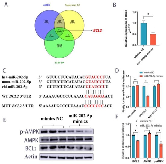 miR-202-5p targets the BCL2 gene. (A) miRDB with Target scan 7.2 databases to predict target genes. (B) qPCR results of BCL2 gene after overexpression of miR-202-5p. (C) Sequence comparison of miR-202-5p with dual luciferase results. (D) Fluorescence changes of miR-202-5p and mimics NC after co-staining with PGLOmir, WT-BCL2 and MUT-BCL2. Data are shown as mean ± SD values (n = 6). * p < 0.05 was considered statistically significant. Ns: data results were not significant. (E,F) Western blotting results of p-AMPK, AMPK and BCL2 after overexpression of miR-202-5p.Data are shown as mean ± SD values (n = 3). * p < 0.05 was considered statistically significant. ns: not significant for statistical results.