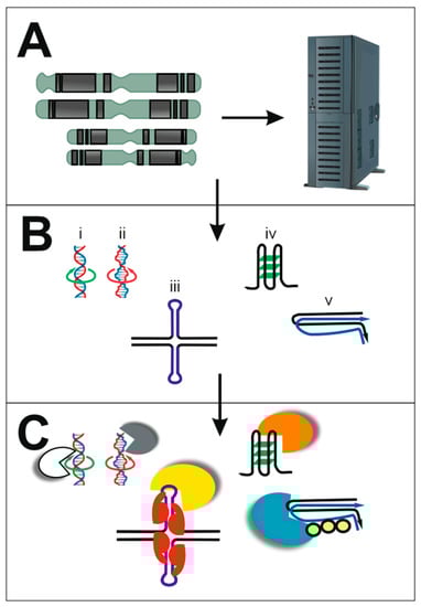 The wealth of DNA sequence information provided by genome-sequencing projects has brought new insights into the primary sequences of genomes and also about possible sequence-dependent local secondary structures [3,18]. Advances provided by such genome sequences are exemplified by the Human Genome Project, with complete telomere-to-telomere sequences being finalised in 2022 [19,20]. As highlighted, this Special Issue includes several articles that report on computational biology or bioinformatics studies of DNA sequences [6,7,8,9], identifying unexpected and additional information within them (Figure 1A). In a mini review, Bartas et al. summarize current knowledge about the amino acid composition of various nucleic-acid-binding proteins, highlighting differences across proteins that bind in a sequence-specific manner compared to those that recognize local non-B-DNA structures and those that recognize both types of properties of nucleic acids [6]. Bioinformatic studies of repetitive DNA sequences in Drosophila melanogaster polytene chromosomes show that chromatin structure plays a crucial role in the regulation of gene activity [7]. Recent advances reported by Choi et al. demonstrate that nucleic acids may provide useful tools for building complex logic circuits [8]. Finally, for this grouping of articles, Víglaský explores the organization of genetic information in nucleic acids using a novel orthogonal representation, which proves to be useful in predicting the likelihood of particular regions of nucleic acids to form non-canonical motifs [9].