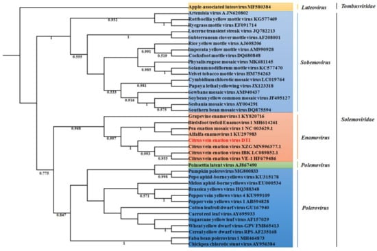 - Vives, M.C.; Velazquez, K.; Antonio Pina, J.; Moreno, P.; Guerri, J.; Navarro, L. Identification of a new enamovirus associated with citrus vein enation disease by deep sequencing of small RNAs. Phytopathology 2013, 103, 1077–1086. [Google Scholar] [CrossRef] [PubMed]