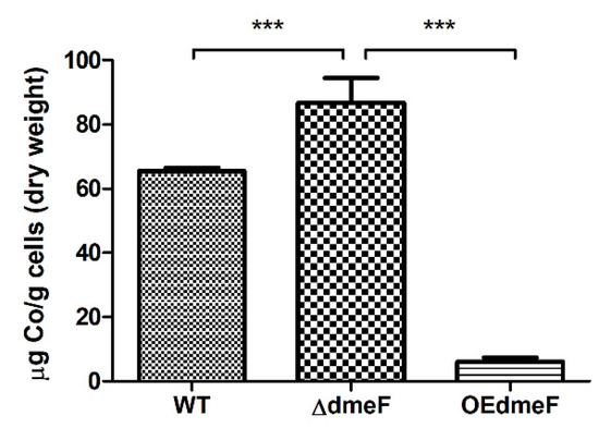 2.4. The ΔdmeF Mutant Accumulated Increased Levels of Cellular Cobalt Content