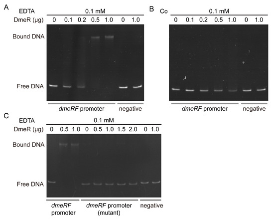 2.5. DmeR Negatively Regulates the dmeRF Operon by Binding Directly to the Promoter While Cobalt Inhibits the Interaction
