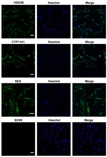Identification of ALCs. Isolated cells were positive for LC markers (HSD3B, CYP11A1, NES) but negative for SC marker SOX9. The scale bar represents 100 μm.
