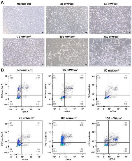 Biosafety assessment of LIPUS. LIPUS of different intensities was applied to LCs to evaluate its biosafety. The results of light microscope observation (A) and Annexin-V and PI staining and flow cytometry (B) demonstrated that 100 mW/cm2 and 150 mW/cm2 LIPUS will cause more apoptosis to LCs. The scale bar represents 100 μm.