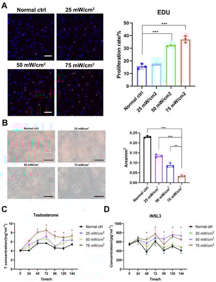Further observation of the effect of LIPUS treatment revealed that stimulation at 50 and 75 mW/cm2 promoted a significant increase in aged LCs proliferation compared with 25 mW/cm2 (Figure 3A). Oil Red O staining showed a significant decrease in the amount of lipid droplets in aged LCs after the LIPUS treatment of the cells and an increase with higher energy (Figure 3B). By assaying the testosterone and INSL3 levels at different time periods after LIPUS stimulation, we found that testosterone levels were significantly higher in the group treated with 50 mW/cm2 and 75 mW/cm2 after three consecutive days of LIPUS stimulation. Meanwhile, after three days of LIPUS stimulation, the in vitro testosterone production capacity of LCs was still significantly increased compared to the untreated group after the fluid change at the end of stimulation (Figure 3C,D). Also, testosterone and INSL3 secretion functions and intracellular lipid droplets are the functional features of LCs. Therefore, LIPUS treatments at 50 and 75 mW/cm2 were safe and effective for the stimulation of aged LCs.