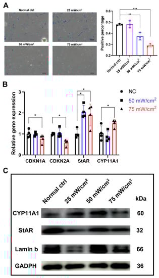 After LIPUS treatment for 3 days, b-gal staining showed that the percentage of senescent cells was significantly lower in the 50 mW/cm2 and 75 mW/cm2 treated groups compared to the untreated group, and the percentage was also significantly lower in the 75 mW/cm2 group compared to the 50 mW/cm2 group (Figure 4A). The transcript levels of aging-related genes CDKN1A(p21) and CDKN2A (p16), and the protein levels of Lamin B were also examined; we found that the 75 mW/cm2 group reduced the expression of p16 and p21, while the 25 mW/cm2 group significantly lowered the Lamin b expression (Figure 4B,C and Figure S2). In addition, by analyzing the testosterone synthesis pathway specific markers CYP11A1 and StAR, we found that the expression level of StAR was significantly higher in both groups, while the level of CYP11A1 was significantly higher in the 75 mW/cm2 group compared to that of the untreated group and the 50 mW/cm2 group (Figure 4B).