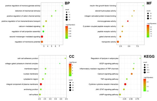 Transcriptome bioinformatic analysis of LCs with and without LIPUS stimulation. The Gene Ontology (GO) analysis including biological process (BP), cellular component (CC), and molecular function (MF) and Kyoto Encyclopedia of Genes and Genomes (KEGG) analysis according to the DEGs between the LIPUS group and normal control are shown as a bubble diagram. A gradient of red to green indicates low to high p values in the bubble diagram and the size of the bubbles indicates the count of enriched DEGs for each GO term.