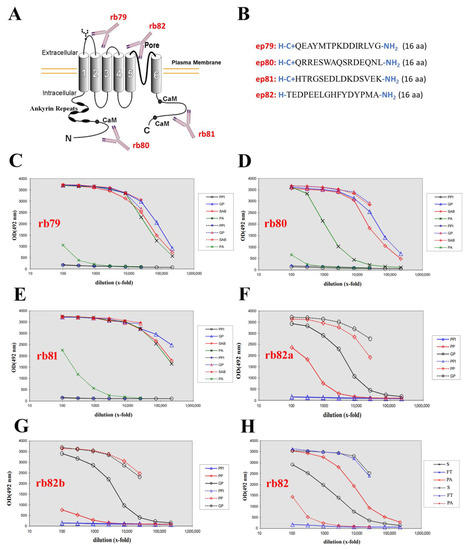 Design and immunoblotting of different rabbit polyclonal anti-TRPV6 channel antibodies. (A), The general scheme of the channel and the relative position of the epitopes for the four antibodies, 79–82 (base image of the channel from http://atlasgeneticsoncology.org/, accessed on the 1 May 2009). (B), the corresponding epitopes used to generate anti-TRPV6 antibodies, and C—cysteine used to couple with the KLH protein. (C–H), ELISA analysis using immobilized peptides. PPI—pre-immune serum, GP—large bleed, SAB—final bleed, PA—purified antibodies, PP—small bleed, S—serum, FT—flow through. Straight line—peptide; discontinuous line—carrier. (C), the ELISA analysis of the rb79 antibody. (D), the ELISA analysis of the rb80 antibody. (E), the ELISA analysis of the rb81 antibody. (F), the ELISA analysis of the rb82a antibody (rabbit 2358). (G), the ELISA analysis of rb82b antibody (rabbit 2359). (H), final bleed, and antibody purification from rabbit 2358 followed by ELISA analysis of the rb82 antibody.
