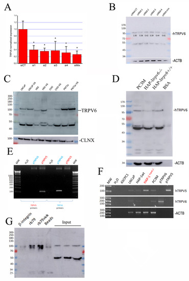 rb79 validation using knockdown, overexpression, and knockout models. (A), Quantitative real-time PCR of the TRPV6 channel in the LNCaP cells transfected either with the 40 µM control siRNA (luciferase) or with the 40 nM siRNAs 1–4 against the TRPV6 channel or their mixture as compared to HPRT gene expression (see Table 1 for primers); n = 3, * p < 0.05. (B), A corresponding immunoblotting of the protein lysates from the siRNA-treated LNCaP cells under the same conditions as in (A), and the quantification of the bands as compared to ACTB. (C), transfection of the TRPV6 channel using the vEF1ap-5′UTR-TRPV6_CMVp-mCherry vector in LNCaP, HEK, CHO, and PNT1A cell lines and the corresponding immunoblotting. (D), TRPV6 protein expression in PC-3M, HAP-1trpv6−/−, and HAP-1trpv6+/+ cell models versus BSA protein revealed using rb79, as compared to ACTB expression. (E), semi-quantitative PCR using TRPV6 and TRPV5 discriminative primers listed in Table 1 on both pTRPV6 and pTRPV5 plasmids. (F), semi-quantitative PCR using the same discriminative primers as in (E) to detect both TRPV6 and TRPV5 transcripts in various cell lines, including HAP-1trpv6−/−. Corresponding TRPV5/6 plasmids were used as positive controls, and ACTB expression was used as a housekeeping gene. (G), the immunoprecipitation of LNCaP total cell lysates using anti-B-integrin, rb79, rb79-enriched conditions, and beads as a negative control, as well as the input. The blot was revealed using rb79.