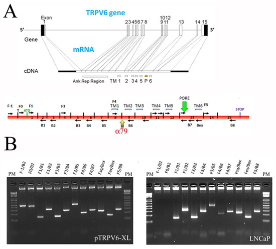 RNA profiling of the mRNA of the TRPV6 channel. (A), the general scheme of the TRPV6 gene with the relative position of the introns and exons and the final spliced mRNA of the TRPV6 gene (gene scheme from http://atlasgeneticsoncology.org/, accessed on 1 May 2009), with the position of the primers listed in Table 2 with the expected sizes and targeted exons indicated in the Table 3, the epitope of the antibody rb79, transmembrane, and pore regions. (B), RNA profiling using the set of primers and their expected sizes from Table 3 using the vEF1ap-5’UTR-TRPV6_CMVp-mCherry vector alone (left panel) and the total cDNA from the LNCaP cells (right panel).