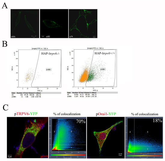 The additional experiment using FACS has been performed where cells were not permeabilized with Triton X-100. HAP-1trpv6−/− cell model has been used as compared to HAP-1trpv6+/+ cells (Figure 5B). HAP-1trpv6+/+ cells seem to contain 24.58% TRPV6 positive cells at the plasma membrane versus 3.8% in HAP-1trpv6−/−.