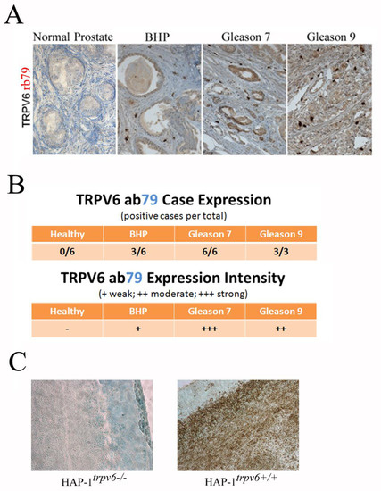 TRPV6 detection in human clinical samples using rb79. (A), IHC using rb79 of the human clinical samples from prostate resection specimens in the case of normal prostate (bladder cancer resection specimen), benign hyperplasia of the prostate (BHP), and adenocarcinoma with Gleason scores 7 and 9 (magnification ×200). (B), statistical analysis of the number of cases expressed and the intensity of those expressions in clinical samples using RB79 in 21 patient cohorts. (C), IHC of tumors slices derived from tumors grafted into nude mice and bearing either HAP-1trpv6−/− (left) or HAP-1trpv6+/+ (right) cell lines (magnification ×200).
