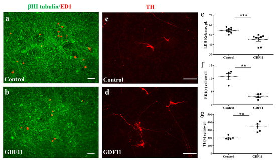 GDF11 enhanced neuronal survival but reduced microglial numbers in neuron–glial cultures. (a,c) Control cells; (b,d) GDF11-treated cells. Cells in (a,b) are immunoreactive (IR) for βIII tubulin (in green) and for ED-1 (in red) and are neurons and microglia, respectively. Magnification: 100×. Cells in (c,d) are tyrosine hydroxylase (TH)-IR dopaminergic neurons. Magnification: 200×. (e) Quantification of lactate dehydrogenase (LDH) release in the culture medium of (a,b). (f) Quantification of ED-1-IR microglia per 0.01516 cm2 in the cultures of (a,b). (g) Quantification of TH-IR cell numbers per well (1.131 cm2) in the cultures of (c,d) from representative images. The results are reported as mean ± SEM in each group from three to four independent experiments. ** p < 0.01, *** p < 0.001 Control versus GDF11 treatment, by unpaired Student t-test. Magnification: 100× in (a,b) and 200× in (c,d). Scale bar: 100 μm.