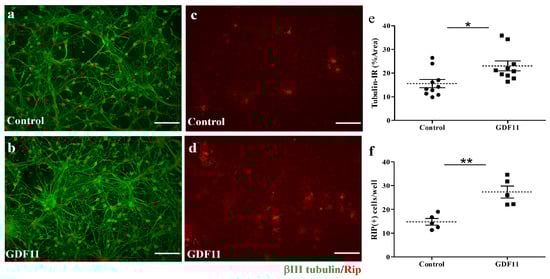 Effect of GDF11 on neuronal or oligodendroglial survivals in neuron–glial cultures. (a,c) Control cells; (b,d) GDF11-treated cells. Cells in (a,b) are βIII tubulin-immunoreactive (IR) neuronal cells. Cells in (c,d) are Rip-IR oligodendroglial cells. (e) Quantification of βIII tubulin-IR cell density in cultures of (a,b) per 0.00356 cm2. (f) Quantification of RIP-IR cell numbers in cultures of (c,d) per 0.00356 cm2. The results are reported as mean ± SEM in each group. * p < 0.05, ** p < 0.01 Control versus GDF11 treatment by unpaired Student t-test. Magnification: 200×. Scale bar: 100 μm.