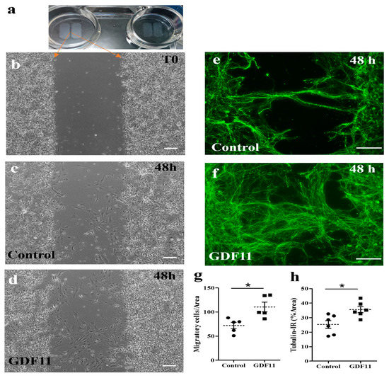 To explore the influence of GDF11 on the growth of neuronal axons and cell migration, spinal cord neuron–glial cultures were also seeded in ibidi inserts in 4-well plates. There was a gap of approximately 500 μm between two insert wells. Several hours after cell seeding, the insert was removed and the cultured cells were refilled with fresh medium (DMEM + 4% FCS) in the presence or absence of GDF11 240 ng/mL. The seeded cells (at T0 shown in Figure 3a,b) started to migrate or extend neurites actively. Neuron–glial cultures were incubated for a total of 2 days. The results showed that GDF11 markedly promoted neurite extension with more tubulin-IR neurites found in the gap than those in control cells (p < 0.05; Figure 3e,f,h). The tubulin-IR (% area) are based on a gap area (width × height) of about 289,940 μm2 at 20× objective. Concurrently, GDF11 markedly induced cell migration toward the gap (p < 0.05; Figure 3c,d,g). The migratory cells were counted in the area of about 632,016 μm2 at 10× objective.