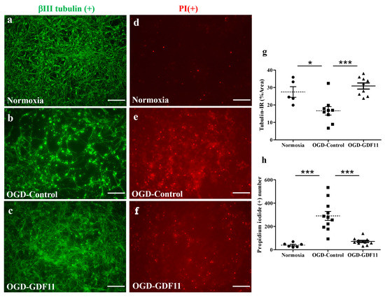 Oxygen glucose deprivation (OGD), an in vitro ischemic model, and lipopolysaccharide (LPS) stimulation were employed to examine whether GDF11 was able to protect the stressed cultures. To examine the pharmacological effects of GDF11 on OGD-induced damage, spinal cord neuron–glial cultures first underwent 3 h of OGD stress and were restored to normoxic conditions. Saline or GDF11 240 ng/mL was then added to the cultures, which were further incubated under normoxic conditions for 2 days. OGD-induced cell damage in the spinal cord neuron–glial cultures (Figure 4). GDF11 markedly protected OGD-induced cell damage, as depicted by tubulin-IR or propidium iodide (PI) positive cells in Figure 4b,c,e,f. The densities of tubulin-immunoreactive cells were significantly higher in GDF11-treated cultures compared to those in control cultures after OGD-induced damage (Figure 4b,c,g). Consistently, the numbers of OGD-induced PI-positive cells were markedly attenuated by GDF11 treatment (Figure 4e,f,h).