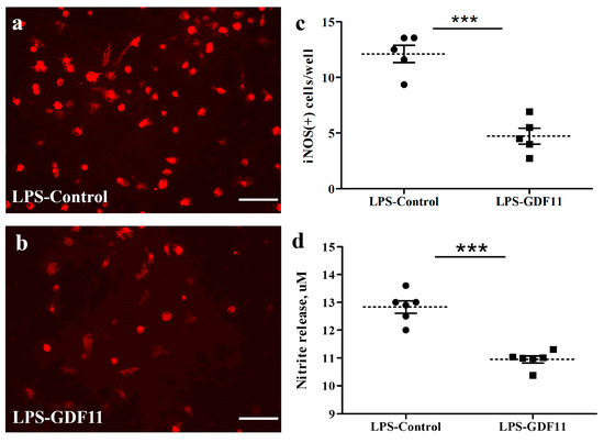 To examine the effect of GDF11 on LPS stimulation, the cultures were switched to a serum-reduced medium (DMEM + 4% FCS). LPS with or without GDF11 was added to the cultures. Two days later, the culture medium was collected for nitrite assay and the cells were processed for immunostaining probing for inducible nitric oxide synthase (iNOS). As shown in Figure 5, GDF11 markedly attenuated the LPS-induced increase in iNOS-IR number and the level of nitrite release to the medium (p < 0.05).