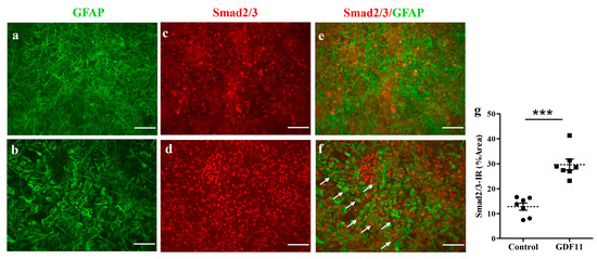 GDF11 is a member of the activin subfamily, which is also classified as a new member of the TGF-β superfamily, capable of activating the Smad2/3 signaling pathway [24]. To explore the pathway by which GDF11 acts, we measured Smad2/3 immunoreactivity in neuron–glial cultures 2 h after GDF11 treatment. Interestingly, GDF11 markedly induced nuclear translocation of Smad2/3 in the cultured cells, with some of Smad2/3-IR being in astroglia, after a 2 h treatment (p < 0.001; Figure 6).
