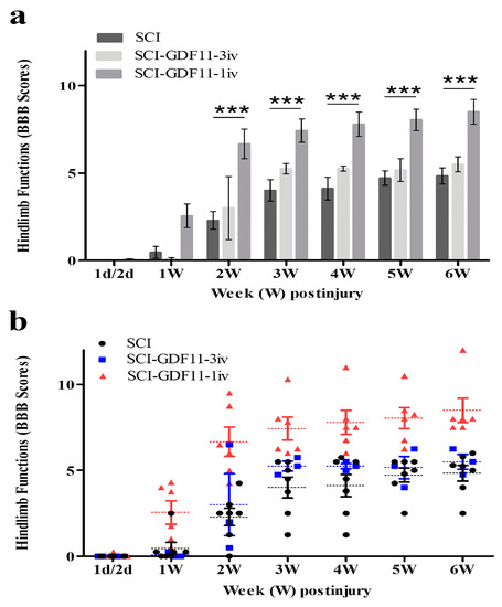 Time course of hindlimb locomotor recovery in rats receiving saline or GDF11 after contusive injury. (a) Data are plotted as a bar chart. (b) Data are plotted with individual data points. Within 30 min of injury, SCI rats were injected with saline or GDF11 through the tail vein once (24 μg/rat) or for 3 consecutive days (8 μg/rat/injection, daily). Locomotor recovery of the SCI rats was evaluated over a 6-week period, using a 21-point scale (Basso–Beattie–Bresnahan (BBB) locomotor rating scale). The hindlimb recovery of the animals was assessed in a double-blind manner. The results are reported as mean ± SEM from 7, 3, and 6 rats for SCI, SCI-GDF11-3iv, and SCI-GDF11-1iv, respectively. Statistical significance was evaluated using two-way ANOVA and Bonferroni’s t-test. *** p < 0.001.