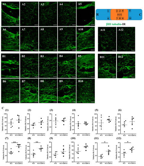 βIII Tubulin-immunoreactive nerve fibers in the thoracic spinal cords of SCI rats 6 weeks after injury. (A) Representative images of longitudinal spinal cord sections in an SCI rat. (B) Representative images of spinal cord sections in a GDF11-treated SCI rat. (C) Quantification of βIII tubulin-positive axons shown in area (1–12) of (A) or (B) panel, from control- or GDF11-treated, respectively, in spinal cord sections. The upper-right scheme shows segments of the thoracic spinal cord (T7~T9; R: rostral; C: caudal). The locations of tubulin-IR photo taken in area (1–12) are depicted. Note the significant increase in tubulin-positive nerve fibers in the GDF11-treated groups in areas (7), (8), (11), and (12) at 6 weeks post-injury. GDF11, 24 μg/rat, was administered to SCI rats through tail vein injection after spinal cord contusion. After 6 weeks, immuno-fluorescence positive areas of βIII tubulin were detected in the longitudinal sections at the epicenter of the spinal cord. The results are reported as mean ± SEM from 5 rats per group. Statistical significance is evaluated using unpaired Student t-test. * p < 0.05, ** p < 0.01, respectively, SCI versus SCI-GDF11. N = 5 rats per group. Magnification: 200×. Scale bar: 100 μm.