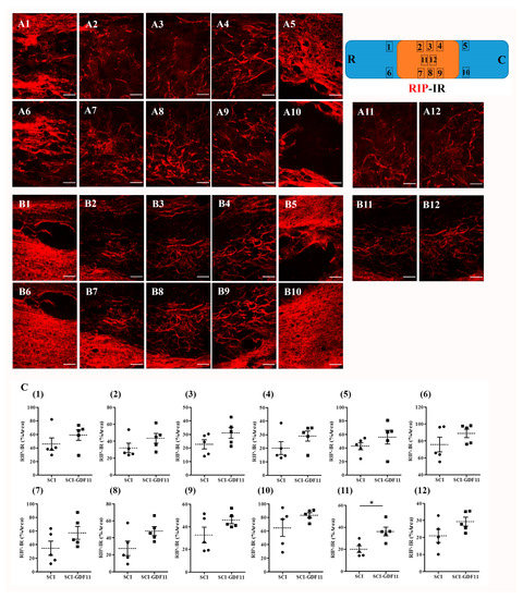 To see the effect of GDF11 treatment on oligodendroglial cells in SCI rats, spinal cord sections were immunostained by anti-RIP probing for oligodendroglial cells. Figure 9 shows RIP-IR in the epicenter of the spinal cord in SCI rats at 6 weeks post-injury. Figure 9C shows the quantification of RIP-IR, shown in area 1–12 of A or B panel, from control- or GDF11-treated spinal cord sections. Note the significant increase in RIP-positive oligodendroglia in the GDF11-treated groups in area 11 at 6 weeks post-injury. RIP-IR in area 8 had a tendency to increase but did not reach a significant level (p = 0.077).