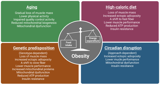 Classically, obesity is defined as abnormal or excessive fat accumulation or an energy imbalance that impairs an individual’s health, usually accompanied by the deposition of lipids in non-adipose tissues, such as the liver, heart, and skeletal muscle [8,9]. As skeletal muscle (referred to as muscle) represents approximately 40% of total body mass in a healthy individual [10], it is quantitatively the most important site when considering the detrimental impacts of obesity on physical and metabolic activities. Known causes of obesity include aging, a lifestyle of chronic high-fat or calorie diets, genetic predisposition, and circadian disruption (Figure 1) [11,12,13,14]. The aged population continues to be a growing population with over two billion people in the world projected to be older than 60 by 2050 [15]. The prominence of the Western “American” diet, characterized by low consumption of fruits and vegetables and contrastingly high consumption of fat and sodium, are major contributors to obesity [16]. Crucially, genetic factors also play a role in determining people’s response to the obesogenic environment, as twin and family studies have estimated the BMI heritability to be >40% [17]. Circadian disruption has also emerged as a new concern due to an astounding number (16%) of American workers involved in non-daytime working hours [18] indicated by a recent meta-analysis to be positively associated with overweight risk [19,20,21,22,23].