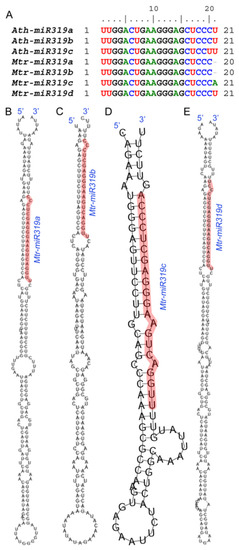 Sequence analysis of miR319 and precursor secondary structure prediction: multiple sequence alignment of miR319 in A. thaliana and M. truncatula (A), A. thaliana sequences of Ath-miR319a, Ath-miR319b and Ath-miR319c, and M. truncatula sequences of Mtr-miR319a, Mtr-miR319b, Mtr-miR319c and Mtr-miR319d were aligned; secondary structure prediction of the precursors of Mtr-miR319a (B), Mtr-miR319b (C), Mtr-miR319c (D), and Mtr-miR319d (E). The mature sequences of Mtr-miR319s are marked in red.
