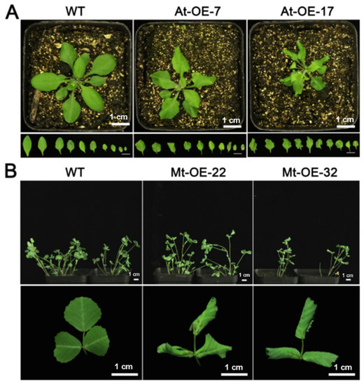 Phenotypes of leaf curl after overexpressing Mtr-miR319a: phenotypes in the leaves of A. thaliana (A) and M. truncatula (B) of the WT and Mtr-miR319a-overexpressing plants. Mature WT A. thaliana plants and Mtr-miR319a-overexpressing plants of At-OE-7 and At-OE-17, as well as mature WT M. truncatula plants and Mtr-miR319a-overexpressing plants of Mt-OE-22 and Mt-OE-32 are shown. Bar = 1 cm.