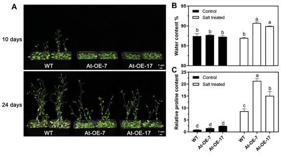 To test the salt tolerance ability of the Mtr-miR319a-overexpressing plants, growth and physiological assays were conducted in A. thaliana and M. truncatula plants under salt stress (Figure 3 and Figure 4). After exposure to high salt conditions for 24 and 35 d in A. thaliana and M. truncatula, respectively, the growth status of all of the overexpressed plants was better than their corresponding WT plants (Figure 3A and Figure 4A). The original plant status before salt treatment at 0 d is shown in Figure 2. Specifically, in A. thaliana, the water content of At-OE-7 and At-OE-17 was significantly higher than that of the WT plants under salt stress, which showed no difference under the control conditions (Figure 3B). The relative proline content was higher in the At-OE-7 and At-OE-17 plants compared to the WT plants under salinity (Figure 3C). In M. truncatula, the MDA content in the overexpression lines did not change after salt stress, whereas it was significantly higher in the WT plant (Figure 4B), and the relative proline content was significantly increased after salt stress while the two overexpression plants had higher levels than the WT plants (Figure 4C). The growth and physiological performances of the WT and Mtr-miR319a overexpression plants after salt stress demonstrated that overexpressing Mtr-miR319a is beneficial for improving salt tolerance in A. thaliana and M. truncatula.