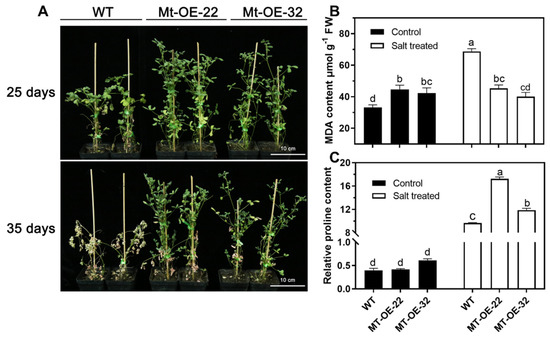 Growth and physiological differences of Mtr-miR319a-overexpressed M. truncatula plants after salt stress: phenotype (A); physiological indicators of MDA content (B); relative proline content (C) of M. truncatula plants overexpressing Mtr-miR319a after salt stress. The WT M. truncatula plants and Mtr-miR319a-overexpressing lines of Mtr-OE-22 and Mtr-OE-32 were exposed to salt stress of 200 mM NaCl for 25 d (A) and 35 d (A–C). The values are shown as the mean ± standard error (SE); n = 3 for the groups. The bars represent the SE. Bars with different lowercase letters indicate statistically significant differences at p < 0.05 based on ANOVA. Bar = 10 cm.