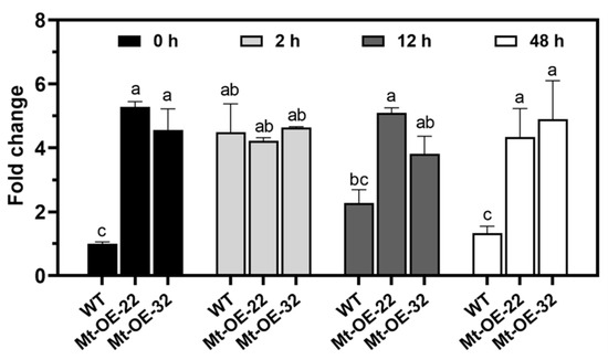 Transcriptional expression profile of Mtr-miR319a in M. truncatula plants after salt stress. The M. truncatula plants of the WT and the Mtr-miR319a overexpression lines of Mtr-OE-22 and Mtr-OE-32 were exposed to 150 mM NaCl for 0, 2, 12, and 48 h. The values are shown as the mean ± standard error (SE); n = 3 for all groups. The bars represent the SE. Bars with different lowercase letters indicate statistically significant differences at p < 0.05 based on ANOVA.