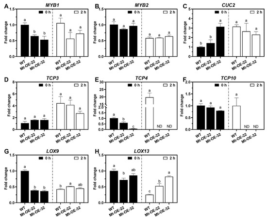 Transcriptional expression analysis of the predicted target genes of Mtr-miR319a in M. truncatula plants before and after salt stress. The predicted target genes of MYB1 (A), MYB2 (B), CUC2 (C), TCP3 (D), TCP4 (E), TCP10 (F), LOX9 (G), and LOX12 (H) were detected. Twenty-eight-day-old WT M. truncatula plants and Mtr-miR319a-overexpressing lines of Mtr-OE-22 and Mtr-OE-32 were detected after exposure to 150 mM NaCl for 0 and 2 h. “ND” represents “Not detected”. The values are shown as the mean ± standard error (SE); n = 3 for all groups. The bars represent the SE. Bars with different lowercase letters indicate statistically significant differences at p < 0.05 based on ANOVA.