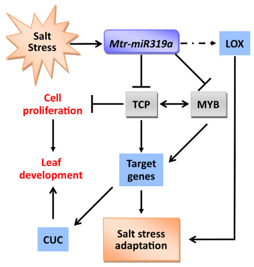 Salinity is a widespread problem that threatens the yield and production of crops across the world [30]. Exploring salt response and tolerance mechanisms can lay the theoretical foundation for salt tolerance genetic improvement and modification of economically important crops. MicroRNAs have been shown to play an essential role in the regulation of gene transcription, protein translation, and cell proliferation [6,8]. Herein, our study firstly verified that the overexpression of Mtr-miR319a can regulate leaf development and salt tolerance via targeting several critical genes (Figure 8), such as TCP, MYB, CUC, and LOX, in M. truncatula plants, which is discussed below.