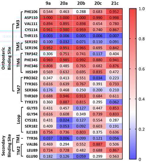Consistent with previous modeling studies, the formation of key interactions between ASP1103.32 and the protonated nitrogen of the ligand stabilized the binding pose of 9a, 20a, 20b, and 20c (frequency of contact > 0.998) by 97.8% to 99.4% of the hydrogen bond formation. However, the frequency of contacts between ASP1103.32 and 20c was relatively lower (frequency of contact = 0.990) and formed only 68.6% of hydrogen bonds over the MDS production runs.