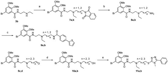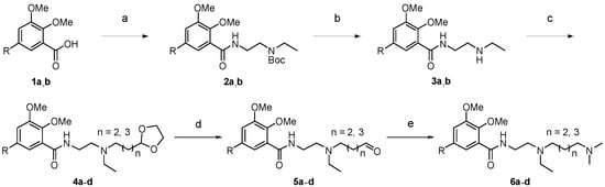 Synthesis of 3-fluoropropyl or bromo analogs which have a dimethyl tert-amine with different length of carbon linker is shown in Scheme 1. 5-(3-Fluoropropyl)-2,3-dimethoxybenzoic acid (1a) or 5-bromo-2,3-dimethoxybenzoic acid (1b) was conjugated with secondary amine Boc-protected tert-butyl (2-aminoethyl)(propyl)carbamate by amide coupling in a quantitative yield. After the removal of the Boc protecting group, free amine 3a or 3b was N-alkylated with 2-(3-bromopropyl) or 2-(4-bromobutyl)-1,3-dioxolane. Dioxolanes 4a to 4d were hydrolyzed using aqueous 4 N HCl at RT to give the aldehyde 5a to 5d which were conjugated with dimethylamine via reductive amination. 5-(3-Fluoropropyl) or 5-bromo-2,3-dimethoxybenzamide analogs having the dimethylamine moiety (6a–d) were obtained in 37–47% yield over the two-step synthesis.