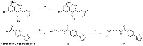 Inspection of the structure of 9a reveals that two different benzamide fragments which share the tert-amine are capable of interacting with the OBS of the D2 and D3 receptors. Therefore, fragments 12 and 14 were synthesized for evaluation in in vitro binding studies (Scheme 3). 12 was synthesized by N-methylation from the secondary amine 3b in 19% yield. For 14, 4-(thiophen-2-yl)benzoic acid was conjugated with 3-bromopropylamine through acyl chlorination followed by N-alkylated with N-methylethanamine.