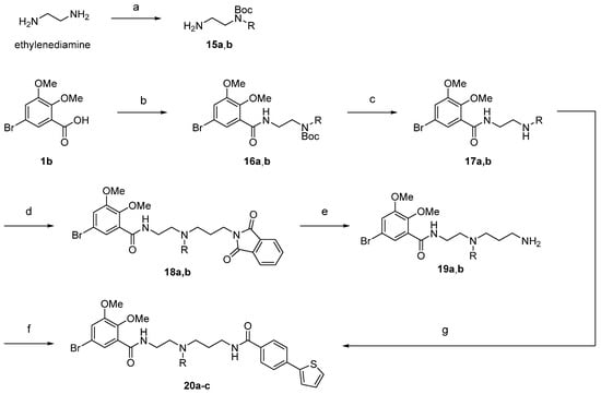 Synthesis of 20a–c for different substituents on tert-amine. Reagents and conditions: (a) (1) ethyl trifluoroacetate, CH2Cl2, 0 °C to RT, 1 h; (2) [for 15a] allyl bromide, Et3N, MeOH, RT, 16 h, then, (Boc)2O, 4 h; [for 15b] 4-fluorobenzaldehyde, NaB(OAc)3, then, (Boc)2O, 4 h; (3) K2CO3, MeOH/H2O (9:1), reflux, 2 h (b) 15a or 15b, HBTU, DIPEA, DMF, RT, 24 h; (c) TFA, CH2Cl2, 0 °C to RT, 1 h; (d) N-(3-bromopropyl)phthalimide, K2CO3, DMF, 65 °C, 16 h; (e) hydrazine hydrate, EtOH, 75 °C, 2 h; (f) [for 20a or 20c] 4-(thiophen-2-yl)benzoic acid, SOCl2, 3 h, then, 19a or 19b, CH2Cl2, RT, 16 h; (g) [for 20b] 13, K2CO3, DMF, 65 °C, 16 h.