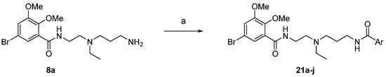 Synthesis of different aryl carboxamides 21a–j. Reagents and conditions: (a) [for 21a] 2-naphthoyl chloride, Et3N, CH2Cl2, RT, 1 h; [for 21b to 21j] aryl carboxylic acids, SOCl2, 3 h, then, 8a, CH2Cl2, RT, 16 h.