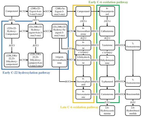 Figure 1. The biosynthesis and metabolism pathways of BR. The blue frame expressed the early C-22 hydroxylation pathway in BR biosynthesis, the yellow frame expressed the late C-6 oxidation pathway, and the green frame expressed the early C-6 oxidation pathway. There are six rate-limiting enzymes of BR biosynthesis, namely CPD, DWF4, ROT3, DET2, BR6OX1, BR6OX2; and one rate-ling enzyme of BR metabolism, namely BAS1.