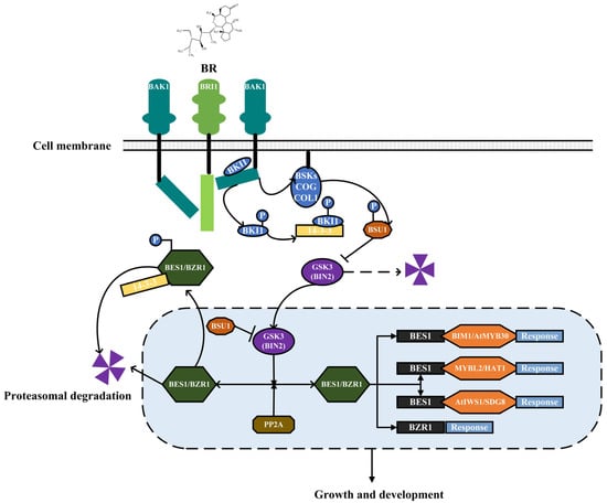 It has been well-elucidated that BR biosynthesis was regulated by a series of structural genes and transcription factors. The conversion of cycloartenol to campesterol sterol, followed by the conversion of campesterol sterol to BR, is the first step in the biosynthesis of BR. The C-6 early and C-6 late are the two primary pathways for BR biosynthesis, and they both require a set of regulatory genes and catalytic enzymes. Several upstream genes dwarf4 (DWF4), deetiolated2 (DET2), constitutive photomorphogenesis and dwarfism (CPD), and 3-epi-6-deoxocathasterone 23-monooxygenase (ROT3), and downstream genes brassinosteroid-6-oxidase1,2 (BR6OX1, BR60X2) were responsible for BR-biosynthesis. Furthermore, PhyB activation-tagged suppressor1 (BAS1) is responsible for BR metabolites and plays an essential role in the stability of BR content in plants [26]. The specific BR biosynthesis and the metabolic pathway are present in Figure 1. On the cell surface of Arabidopsis thaliana, researchers discovered three BR receptors: BRASSINOSTEROID-IN-SENSITIVE 1 (BRI1), Bri1-like 1 (BRL1), and Bri1-like 3 (BRL3) [27]. The activities of both proteins (BRI1 heterodimer and trans-phosphorylation of BRI1-associated kinase 1) were enhanced by BR signaling [28]. When BR levels are high, a cascade of phosphorylation in the BRI1 and BAK1 (Brassinosteroid Insensitive 1 associated kinase receptor 1) proteins was initiated. Subsequently, BSU1/BSLs (BRI1SUPPRESSOR 1) were dephosphorylated and generated BRASSINOSTEROID-INSENSITIVE 2 (BIN2), which was then further inactivated [29]. Furthermore, BES1/BZR1 was dephosphorylated and activated by protein phosphatase 2A (PP2A), which is recognized as a BR signaling positive regulator [30]. In case of a low level of BR in plants, the BR BRI1KINASE INHIBITOR 1 (BKI1) occupies the BRI1 site, and inhibits the interaction of bri1-BAKI1 [31]. Following that, subsequent phosphorylation cascade was repressed, BSU1/BSLs (BR signal receptor protein) were deactivated by dephosphorylation, leading to the activation of BIN2 (Bridging integrator 2) and further transmission of BR signal. In addition, phosphorylated BES1/BZR1 (BRI1 EMS SUPPRESSOR 1/BRASSINAZOLERESISTANT 1) in the cytoplasm was degraded by Ubiquitin Proteasome System (UPS), thus terminating BR signaling [32]. In conclusion, the primary regulatory mechanisms of BR signal transduction were phosphorylation/dephosphorylation and ubiquitination, which are essential components in the BR signaling pathway and also regulated their activity and stability. Overall, the BR signaling pathway has been thoroughly investigated; the unique BR signaling pathway is depicted in Figure 2.