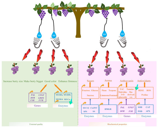 Figure 3. The effect of exogenous BR on the berry external quality improvement and biochemistry biochemical properties formation. External quality included berry size, berry color, and berry firmness. Biochemical properties include sugars (fructose, glucose, and sucrose), aroma substances (β-pinene, terpene, limonene, pentanol), anthocyanin (TAC, tannins, malvidin-3-O-glucoside, Ma-derivatives), and antioxidants (SOD, CAT, POD, APX). The mentioned enzymes and genes related to grape berry quality improvement are also listed in the figure.